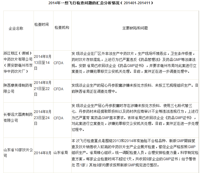 進(jìn)入11月份開始,CFDA的飛行檢查力度和密度更大,監(jiān)管趨勢(shì)更嚴(yán)厲。筆者根據(jù)CFDA網(wǎng)站和各省局網(wǎng)站公布的相關(guān)信息,匯總2014年度的飛行檢查情況如下:
