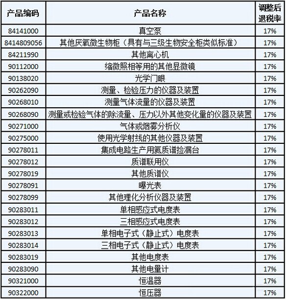 經(jīng)國(guó)務(wù)院批準(zhǔn),近日,財(cái)政部發(fā)布關(guān)于提高機(jī)電、成品油等產(chǎn)品出口退稅率的通知,其中包括了真空泵、質(zhì)譜聯(lián)用儀等實(shí)驗(yàn)室設(shè)備。本次通知提到,將一系列產(chǎn)品的增值稅出口退稅率提高至17%,該通知自2016111日起執(zhí)行。