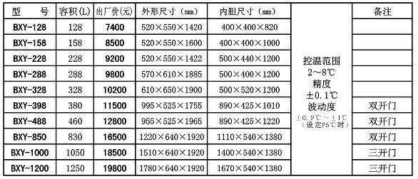 容積:388L;工作室尺寸:890×425×1010;控溫范圍、精度:4℃±2℃;其他參數(shù):雙開門、聲光報警、自動除霜,高精度電腦控溫系統(tǒng)。